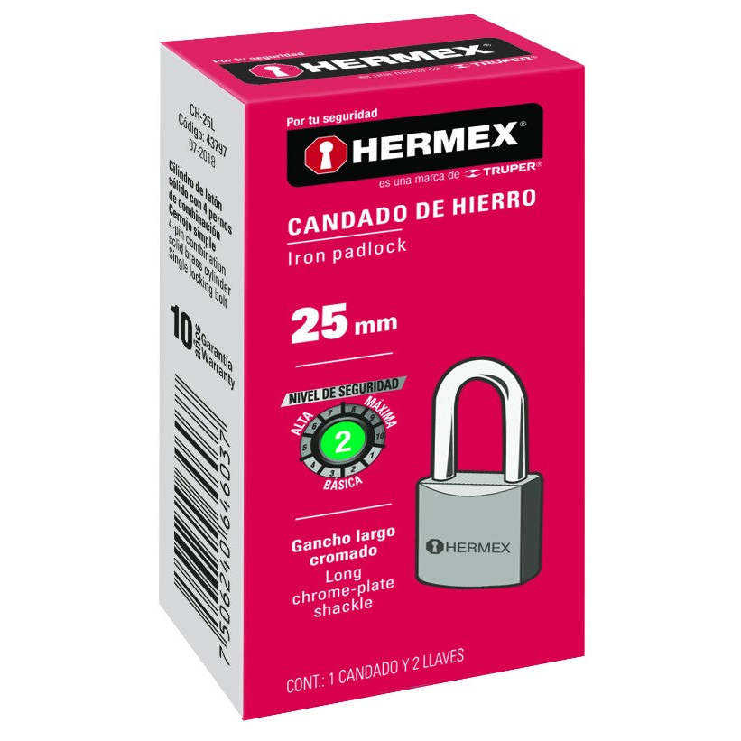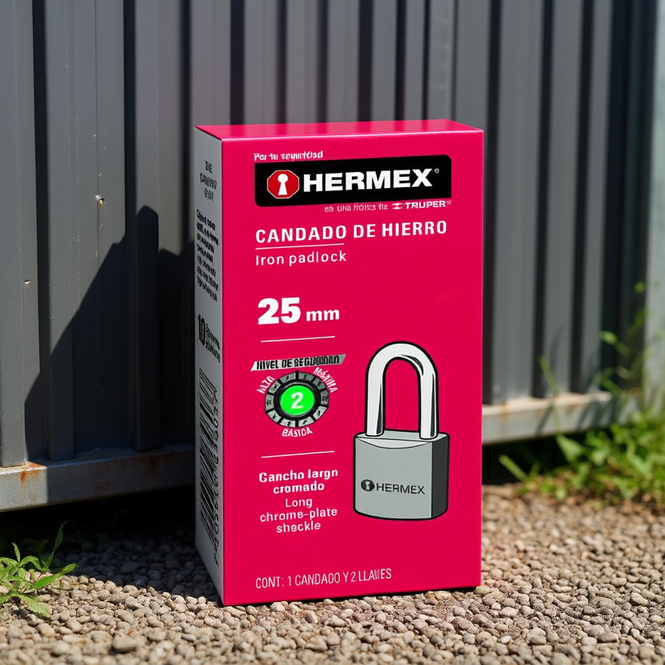 Hermex 25mm Iron Padlock with Long Chrome-Plated Shackle, Solid Brass Cylinder, Waterproof, Single Lever Locking Mechanism, Rect