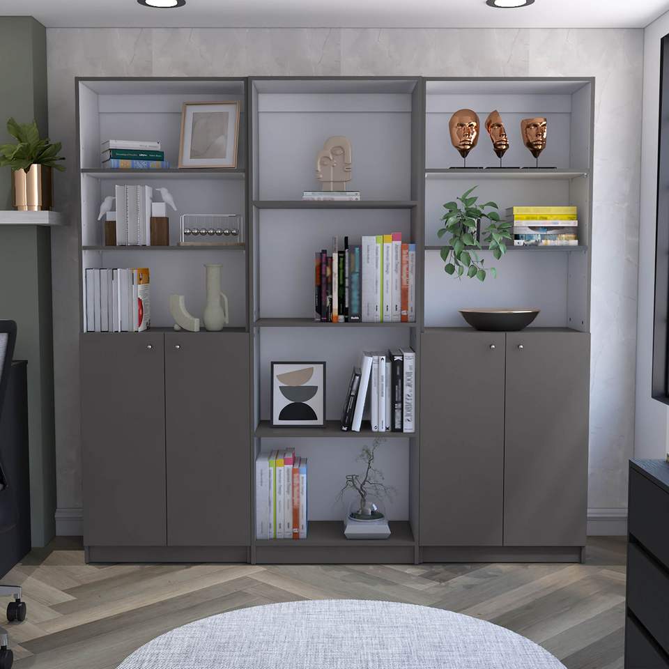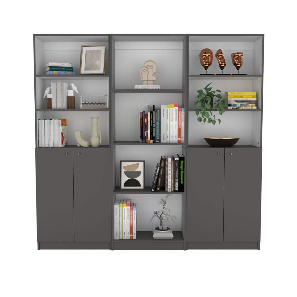 Set di Librerie Hialeah in 3 Pezzi, Grigio Opaco/Bianco, Larghezza 188 cm con 10 Ripiani e Due Armadi a Doppia Anta per Soggiorno