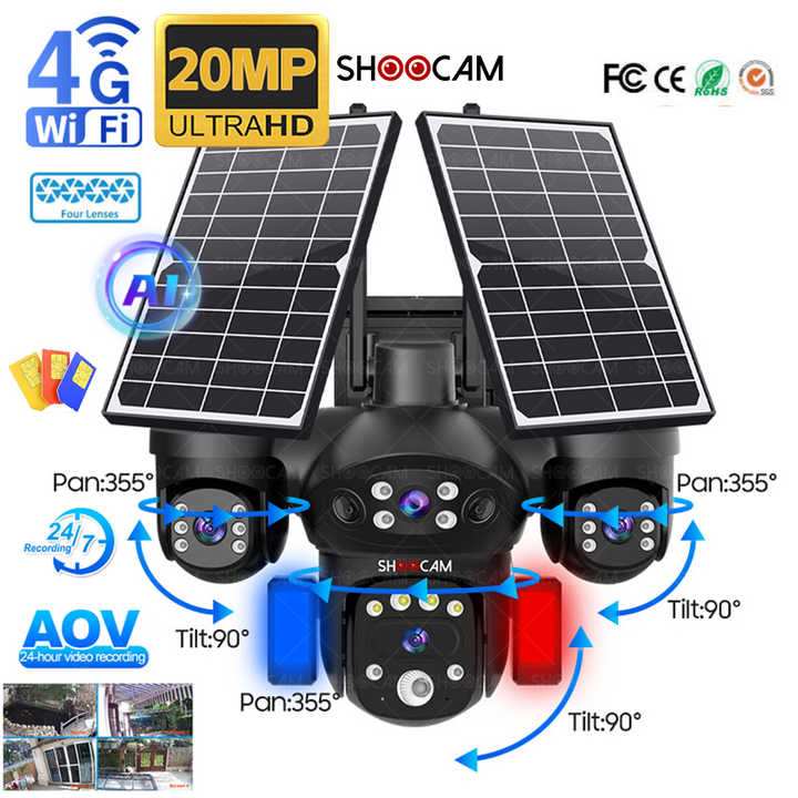 Telecamera di Sicurezza Wireless Hieasy Aov con Video in Tempo Reale 24h, 4 Obiettivi, 20MP, 10K, 4G, Solare, Esterna IP66, PTZ 360°, CCTV IP