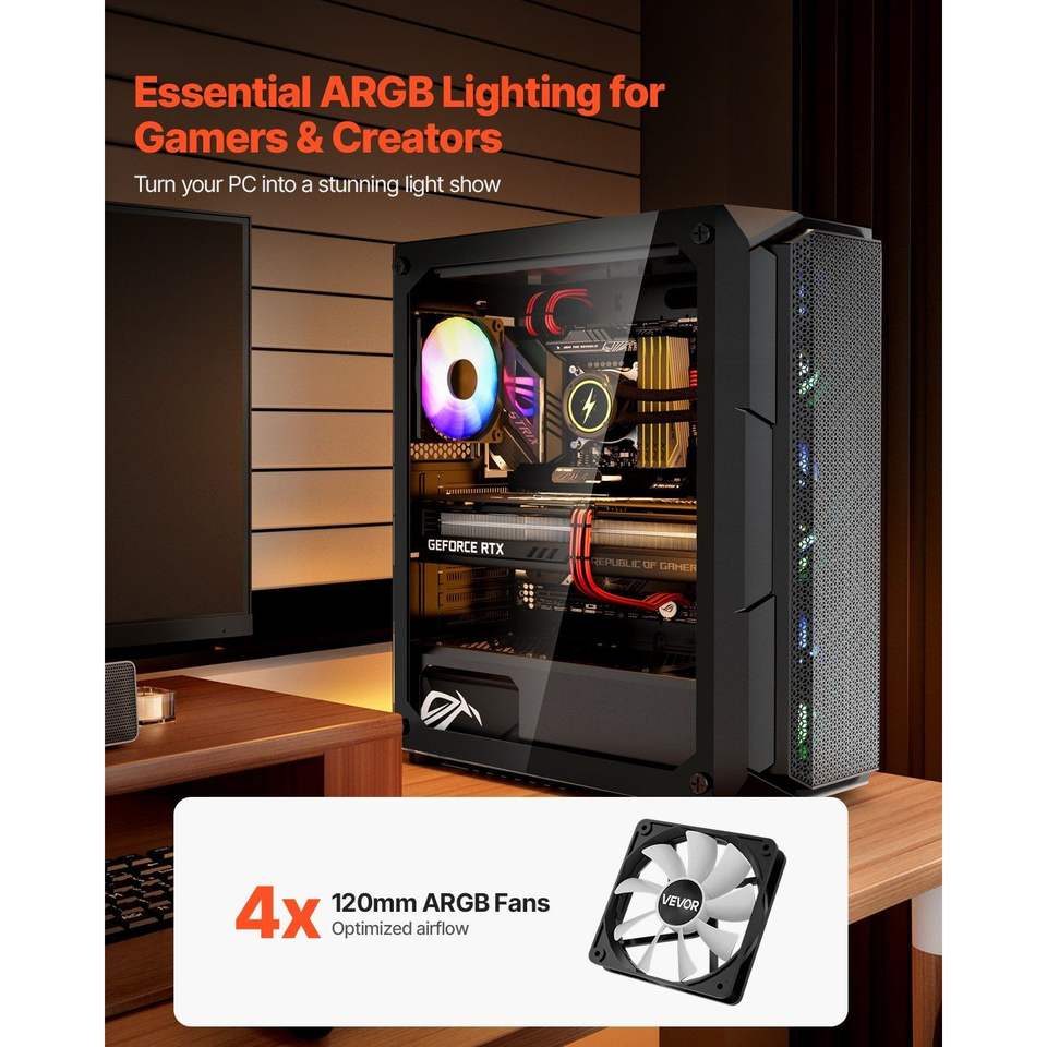 Case PC Gaming Mid-Tower ad Alto Flusso d'Aria con 4 Ventole ARGB da 120 mm e Filtro Antipolvere, Gestione Facile dei Cavi, Pannello in Vetro Temperato
