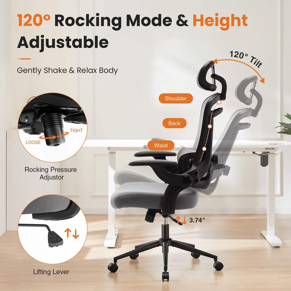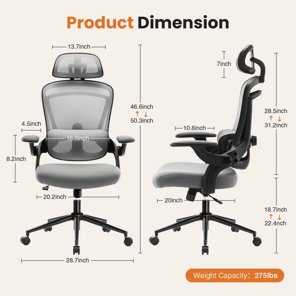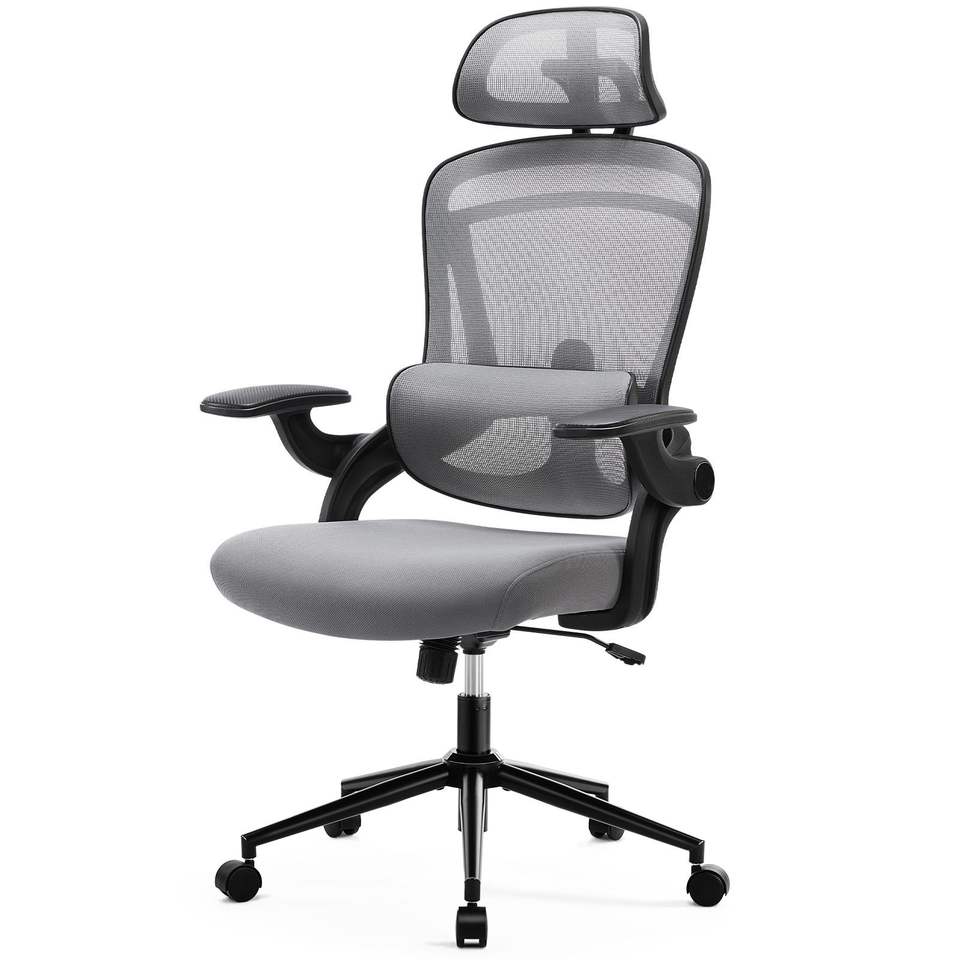 Sedia da Ufficio Ergonomica con Schienale Alto, Design in Rete Traspirante, Supporto Lombare Regolabile, Poggiatesta e Braccioli Morbidi Ribaltabili