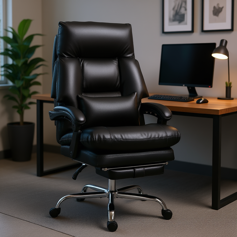 Sedia da Ufficio Reclinabile con Schienale Alto in Pelle PU Nera, Sedia Direzionale con Poggiapiedi, Base in Metallo e Gambe Cromate