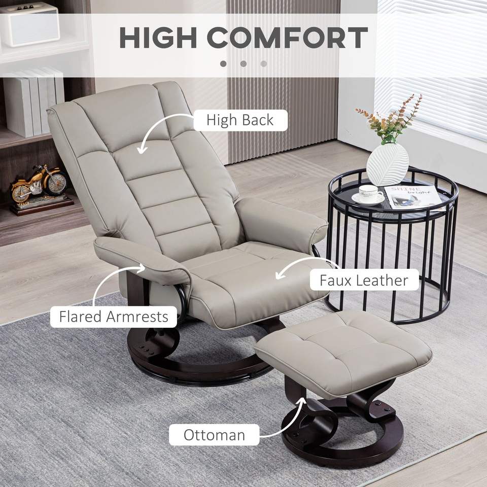 Poltrona Reclinabile Girevole con Schienale Alto e Poggiapiedi in Ecopelle Grigia; Set Poltrona Reclinabile e Poggiapiedi con Base in Legno