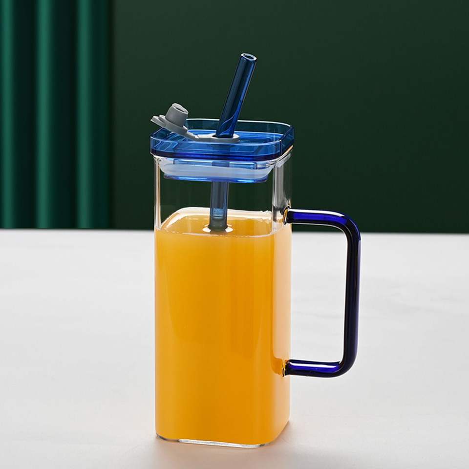 Set per Servire Latte e Succhi con Bicchiere in Vetro Borosilicato Blu Monopezzo e Coperchio Quadrato con Cannuccia in 6 Colori
