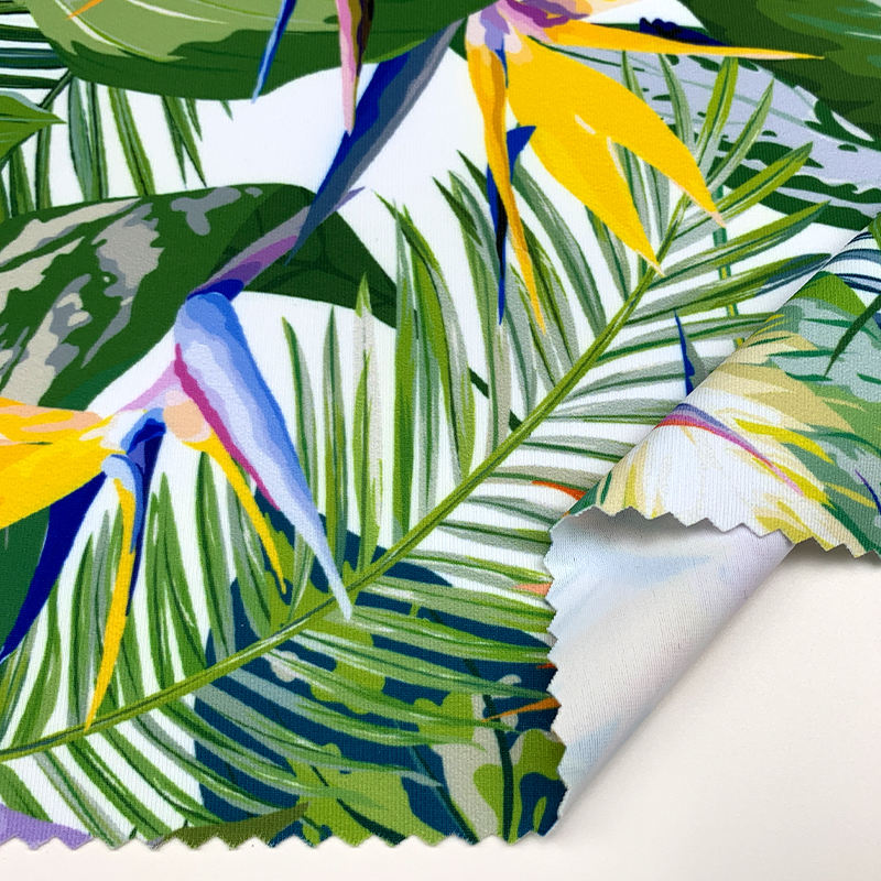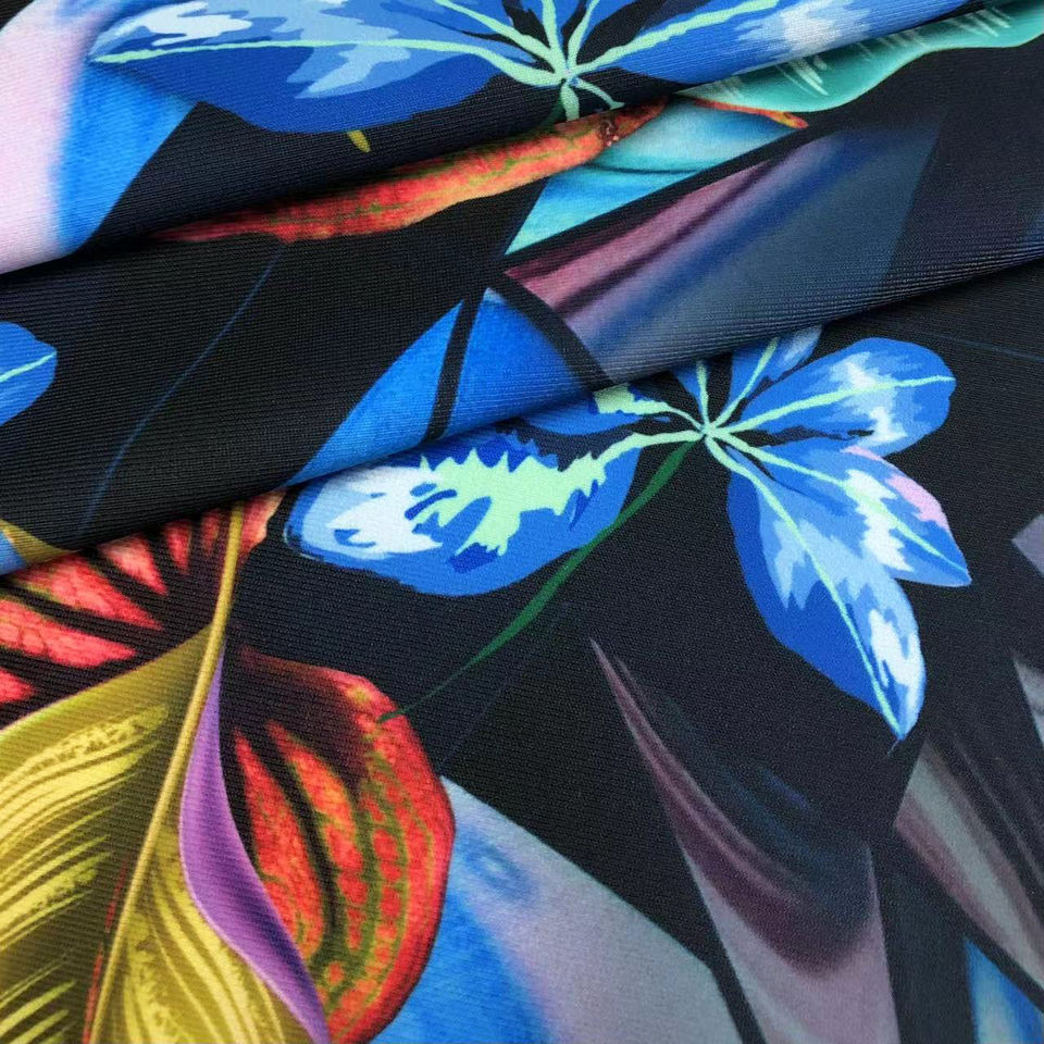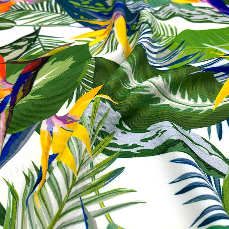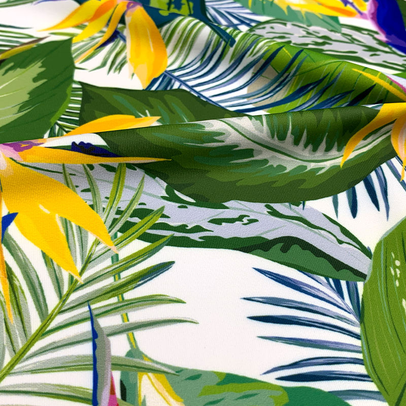 Tessuto Spandex in poliestere stampato tropicale ad alta elasticità morbida e traspirante a 4 vie per costumi da bagno Lingerie vestito Tricot