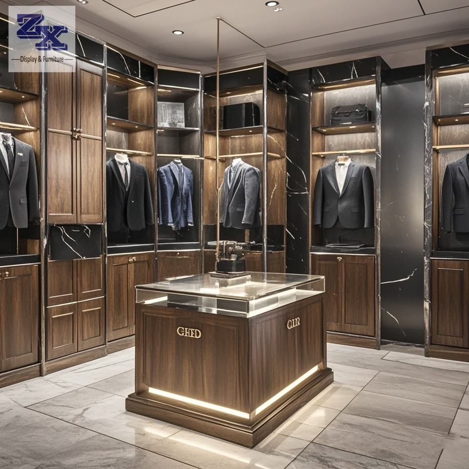 Abiti da uomo di fascia alta espositore con led in venature del legno design per abiti da uomo negozio