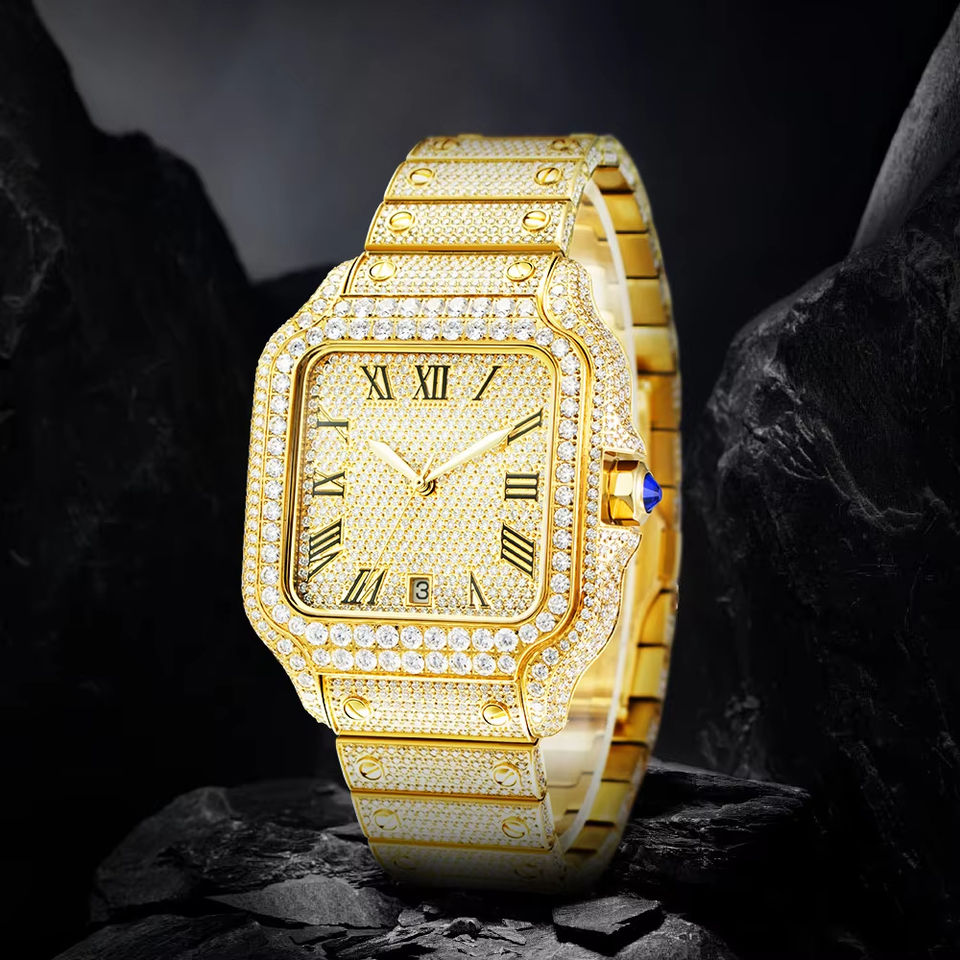 Orologio da Polso Unisex di Lusso con Design Quadrato, Moissanite VVS Dorata, Impermeabile, Stile Sportivo e Alla Moda