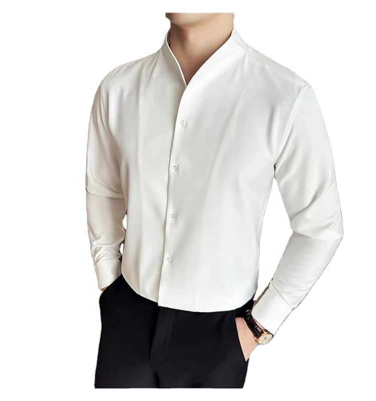 Camicia con scollo a V di fascia alta e Sexy, Design a maniche lunghe da uomo, camicia con colletto in piedi senza colletto e senza cuciture