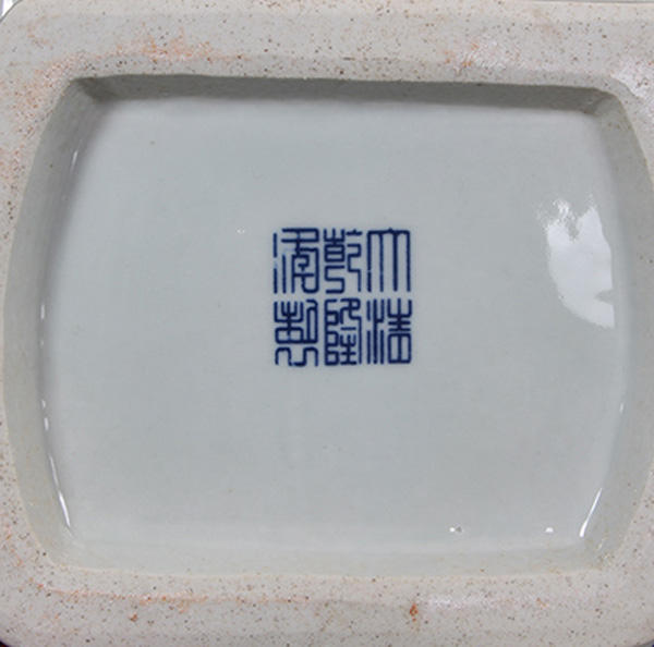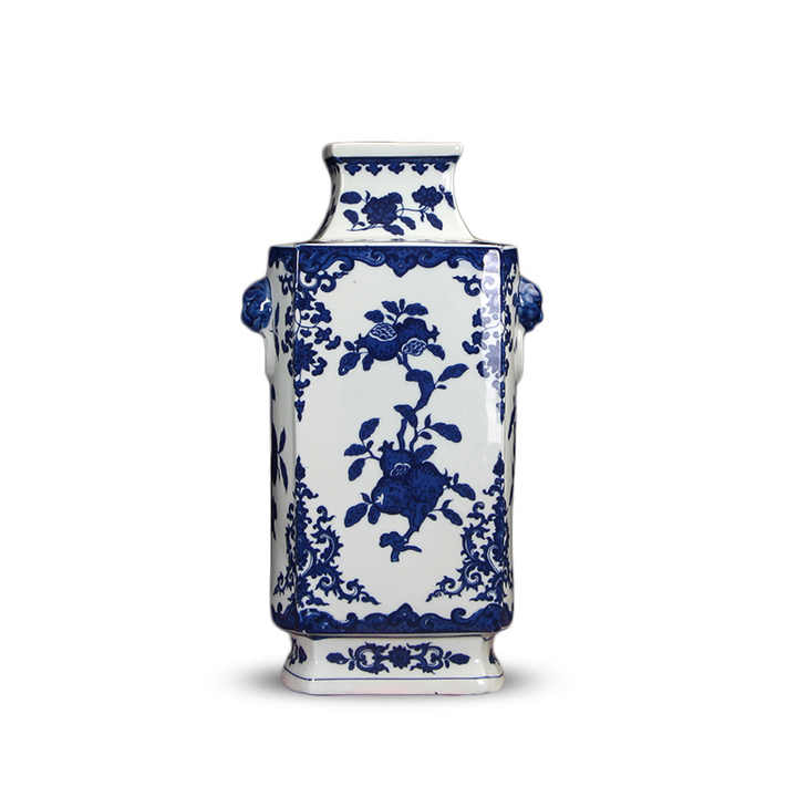 High-Grade Chinese Antique Blue and White Porcelain Square Peach Vase Double Ear Lion Head for Home Decor