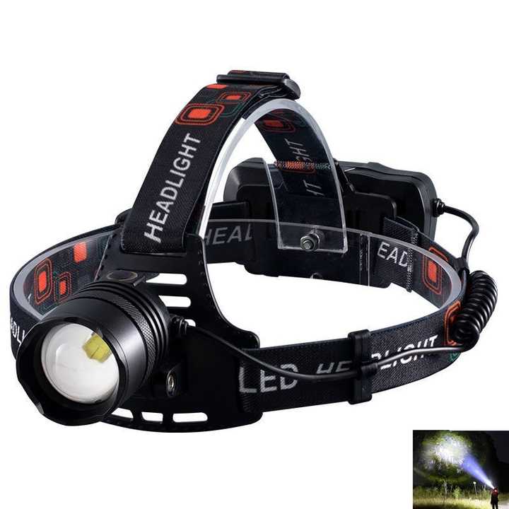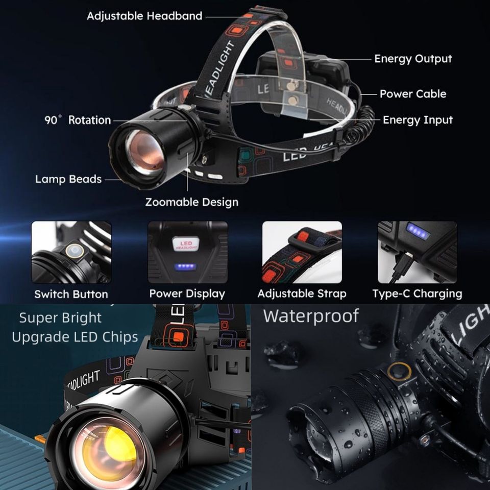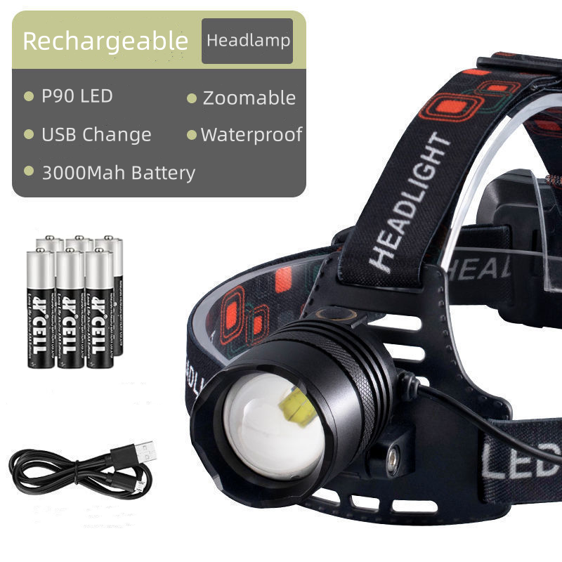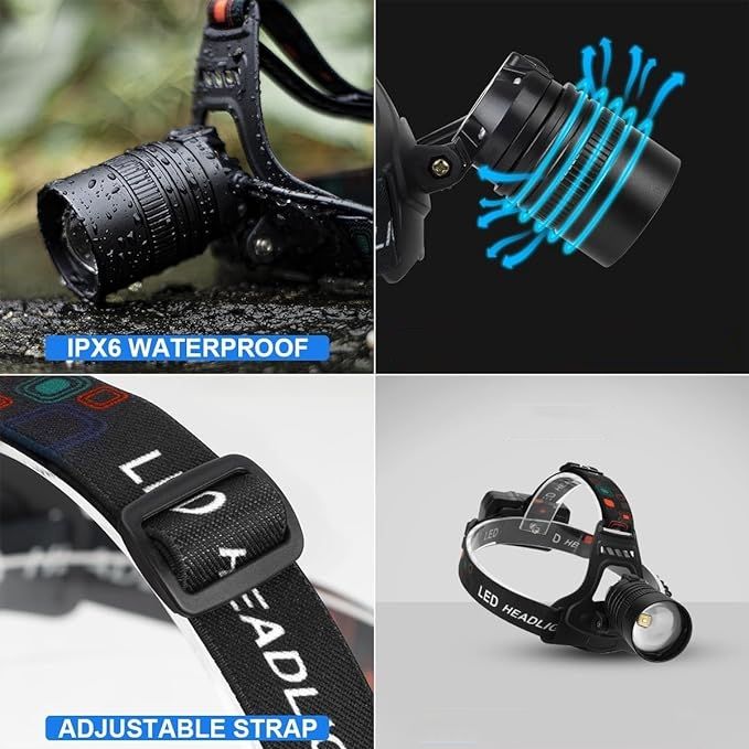 Lampada Frontale LED P70 Ricaricabile ad Alta Luminosità con Batteria 18650, Regolabile a 90° per Campeggio, Caccia, Pesca, Corsa