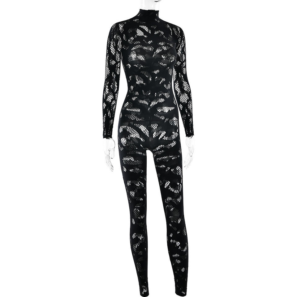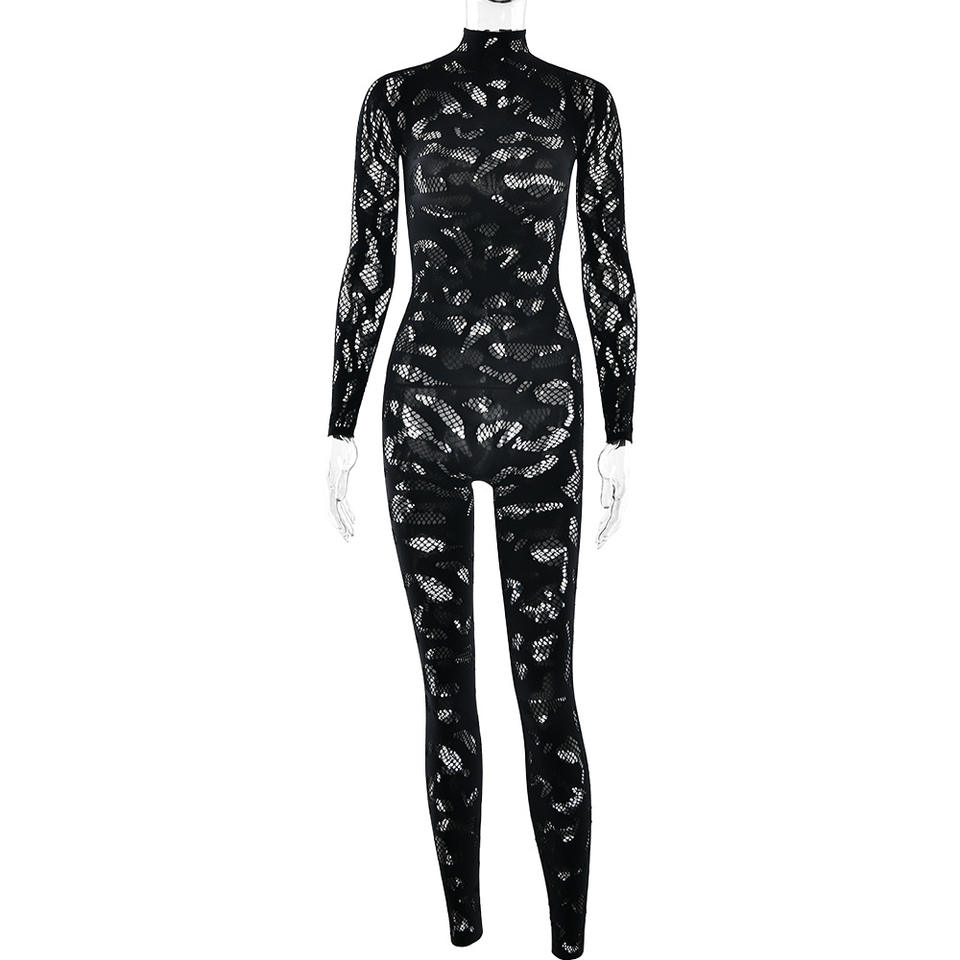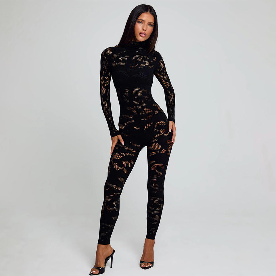 Tuta Intera Aderente a Collo Alto con Maniche Lunghe in Pizzo Nero, Elasticizzata e Casual per Donne