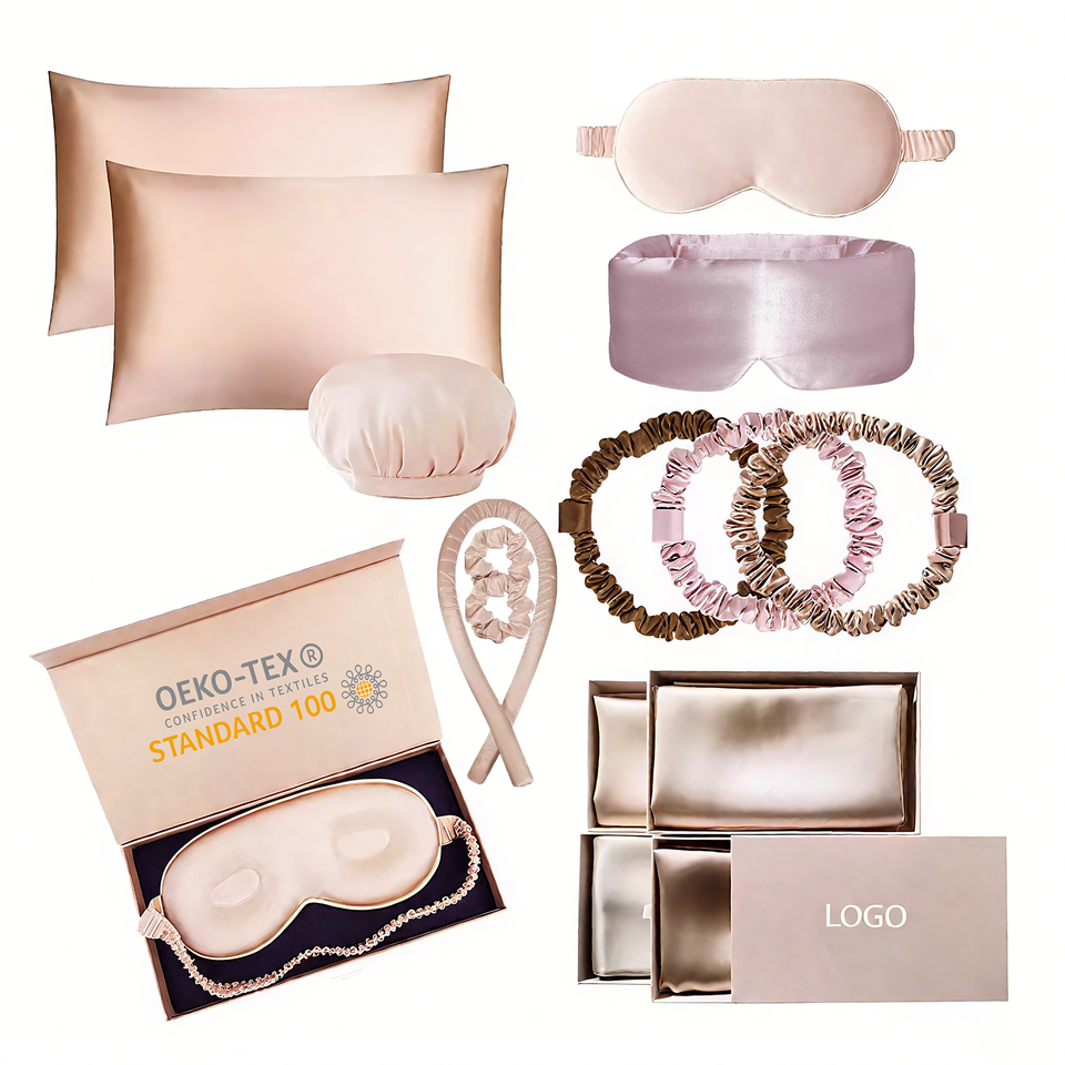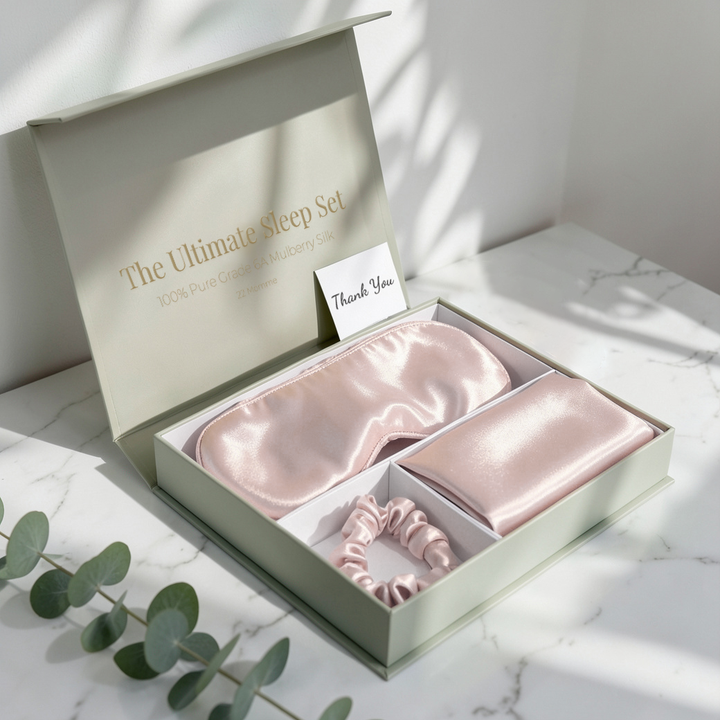 Set di Lusso in Seta di Gelso Biologica 22 Momme ad Alta Purezza, Anti-età e Delicato sulla Pelle: Federa, Maschera Occhi e Elastici per Capelli
