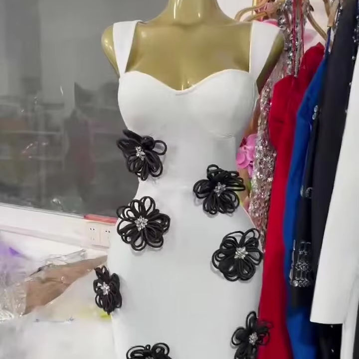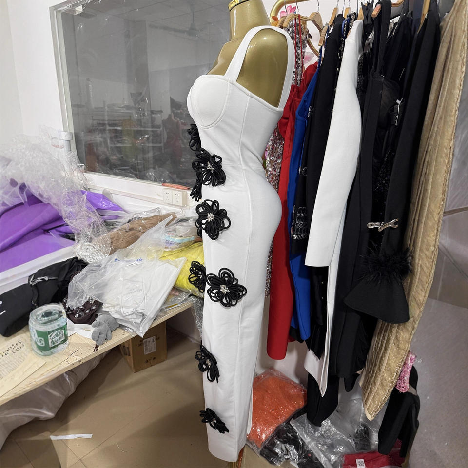 Di alta qualità più venduto 3D fiore nero con cavezza bianca vestito moda abito da sera lungo di lusso per festa