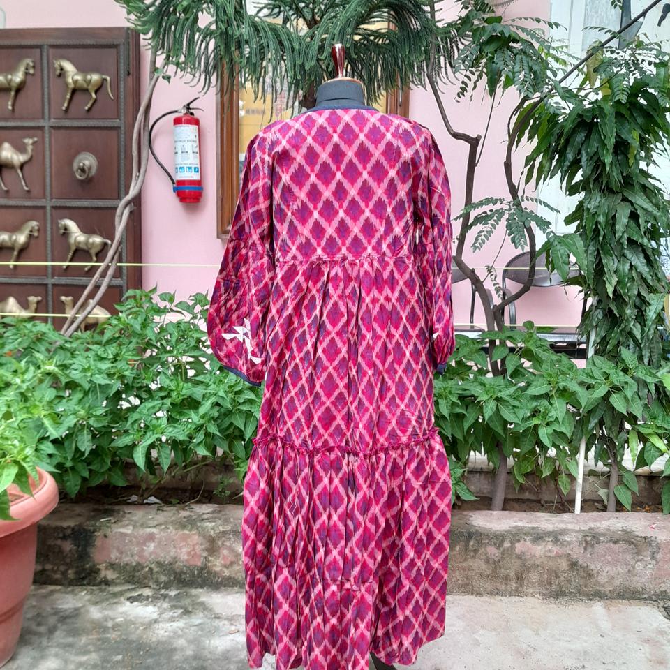 Abito Lungo Casual da Donna in Tessuto di Cotone di Alta Qualità con Stampa a Blocchi, Design Ricamato e Plissettatura a Linea A