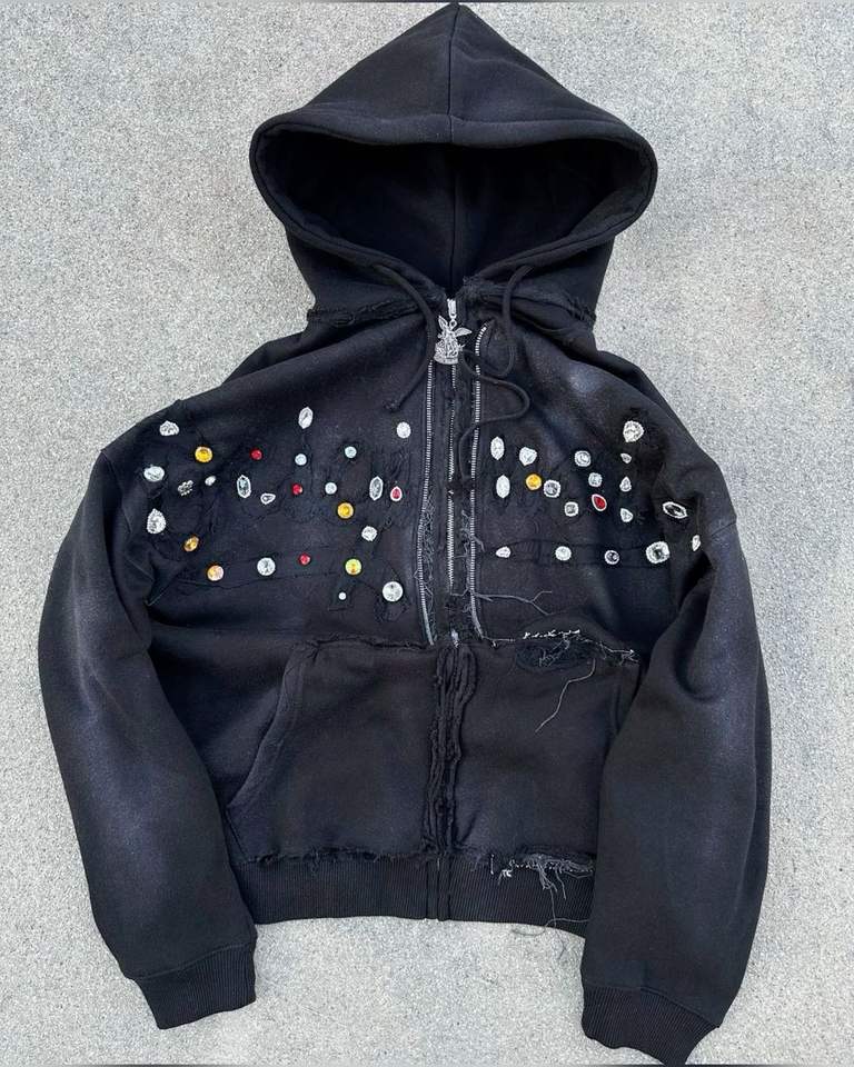Felpa da Uomo con Cappuccio Oversize e Zip in French Terry da 400 g/m² di Alta Qualità, Personalizzata con Borchie Metalliche a Rivetto, Effetto Usurato, Sbiadito dal Sole e Lavaggio Acido Monkey Wash