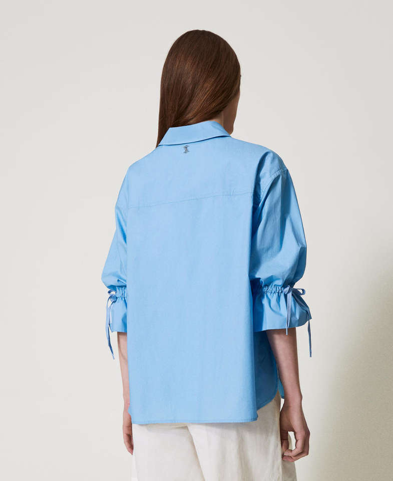 Camicia da Donna di Alta Qualità Personalizzata Blu con Bottoni Motivo Floreale Maniche a Fiocco Medie Colletto Classico