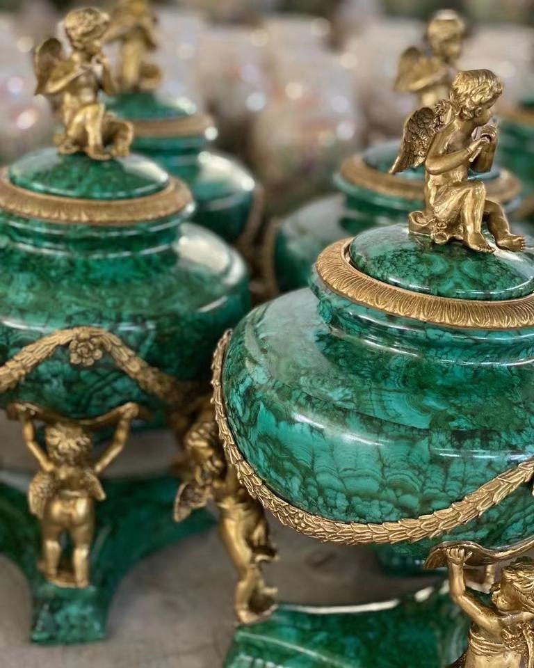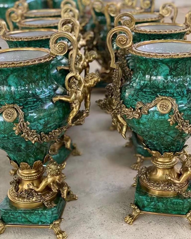 Vaso di Fiori in Ceramica e Bronzo Verde Scuro di Alta Qualità, Stile Francese di Lusso, Antico e Fatto a Mano con Motivo di Uccello