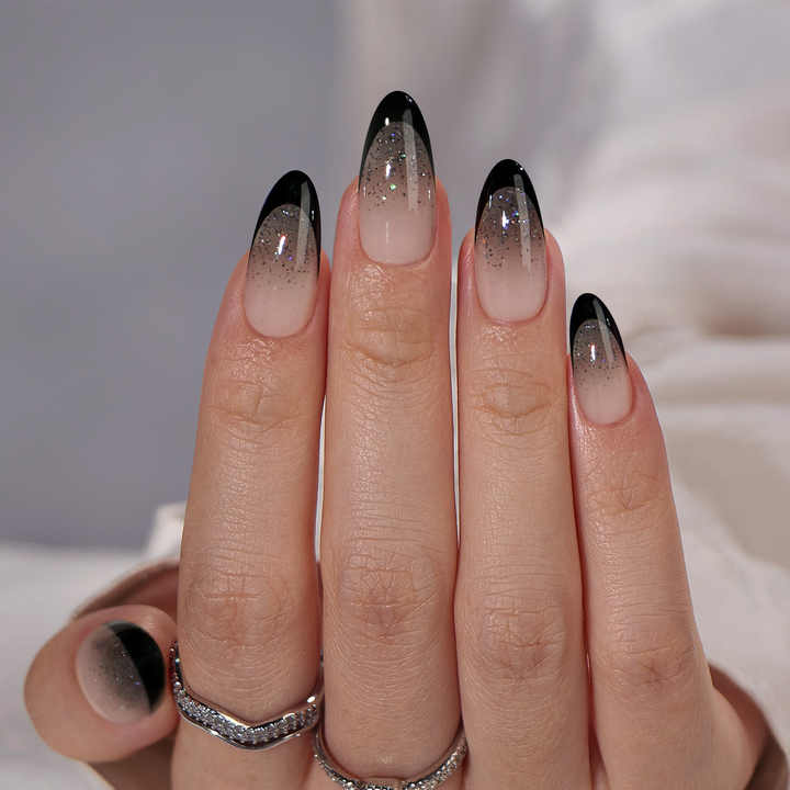 Copertura completa di alta qualità unghie finte Gel morbido medio mandorla nero punta francese fatto a mano Shinny stampa sulle unghie all'ingrosso