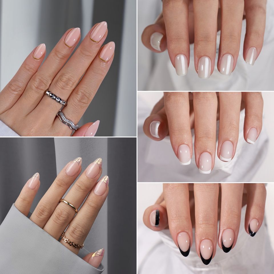 Strumento:Punte per unghie, Colla, Limetta, Tagliaunghie, Linguette adesive, Spingitoio della cuticola, Forma per unghie