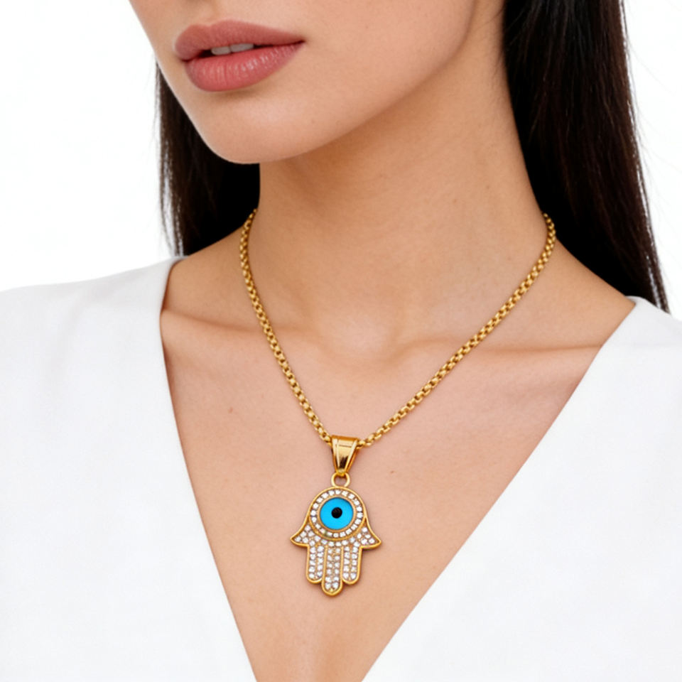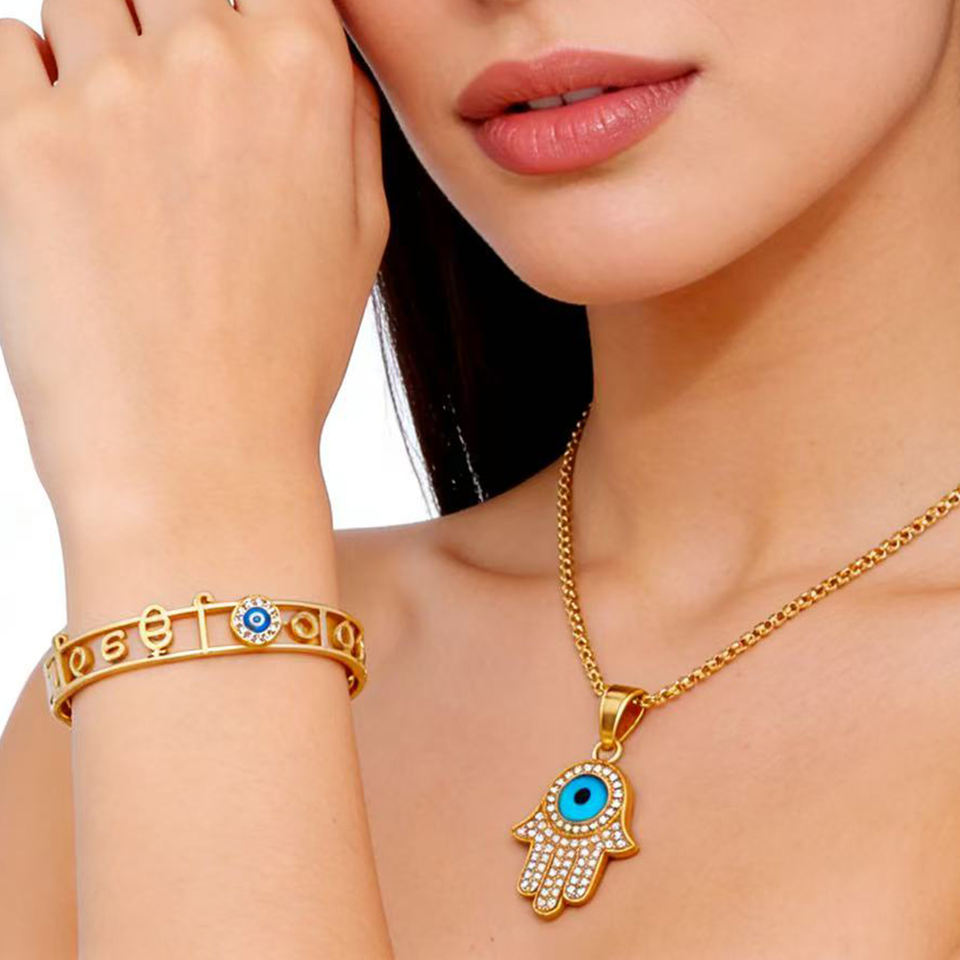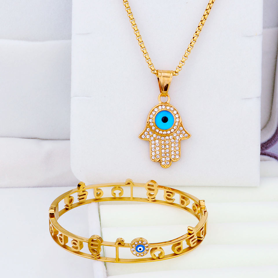 Gioielli Turchi Placcati Oro di Alta Qualità, Amuleto con Alfabeto Latino, Ciondolo Occhio, Mano di Fatima, Collana e Bracciale in Acciaio Inossidabile
