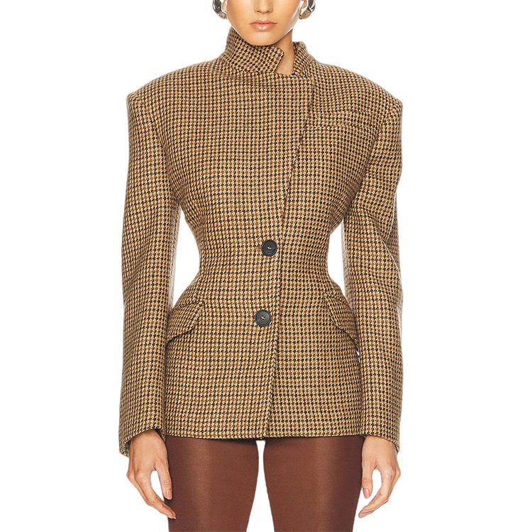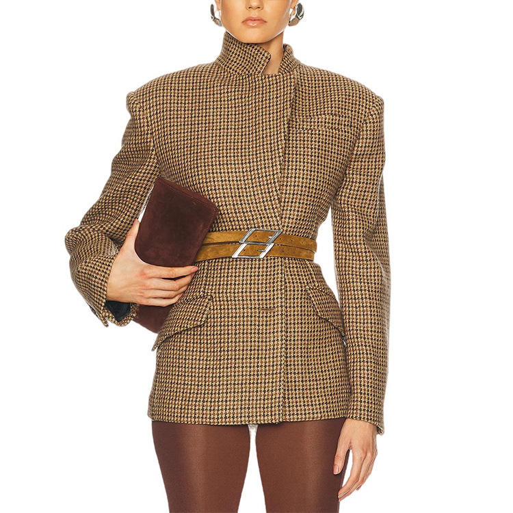 Giacca con collo alto a manica lunga personalizzata di alta qualità abbottonata da donna in lana Tweed a doppia cintura