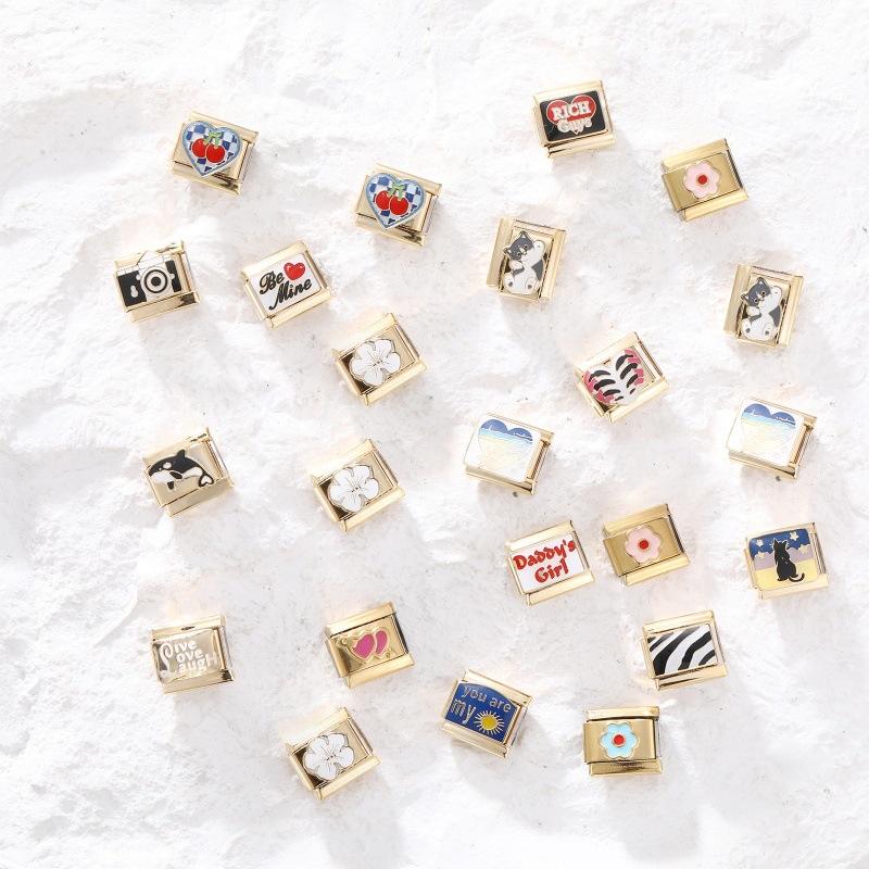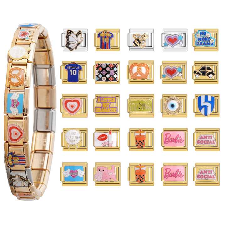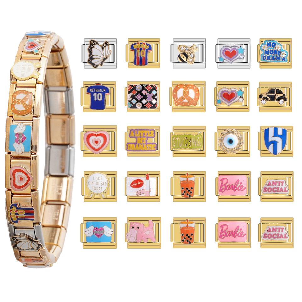 Charm Italiani di Alta Qualità in Acciaio Inossidabile Placcato Oro 18K, Serie Cuore con Frasi, per Bracciali Charm Italiani