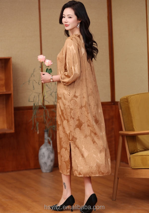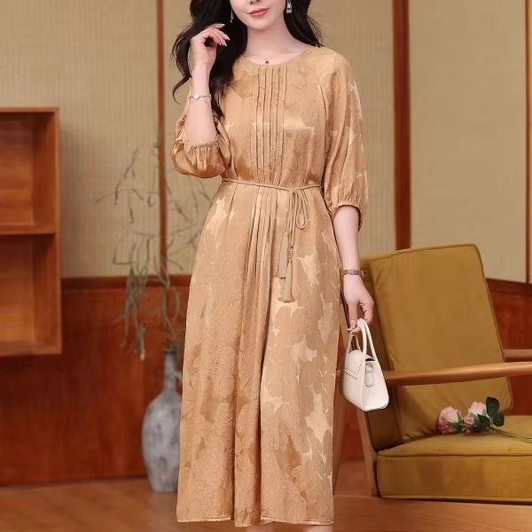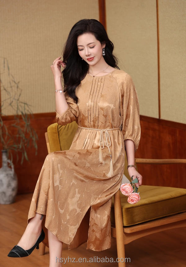 Abito Lungo in Seta Jacquard di Alta Qualità, Stile Francese, Design Casual per Spiaggia e Feste, Lussuoso per Vacanze e Pendolarismo