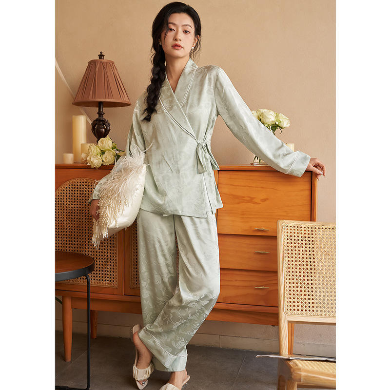 High Quality Light Luxury Ice Silk Pajamas Women's Pajama Spring and Autumn Jacquard Long Sleeve Home Set Nightwear Sleepwear