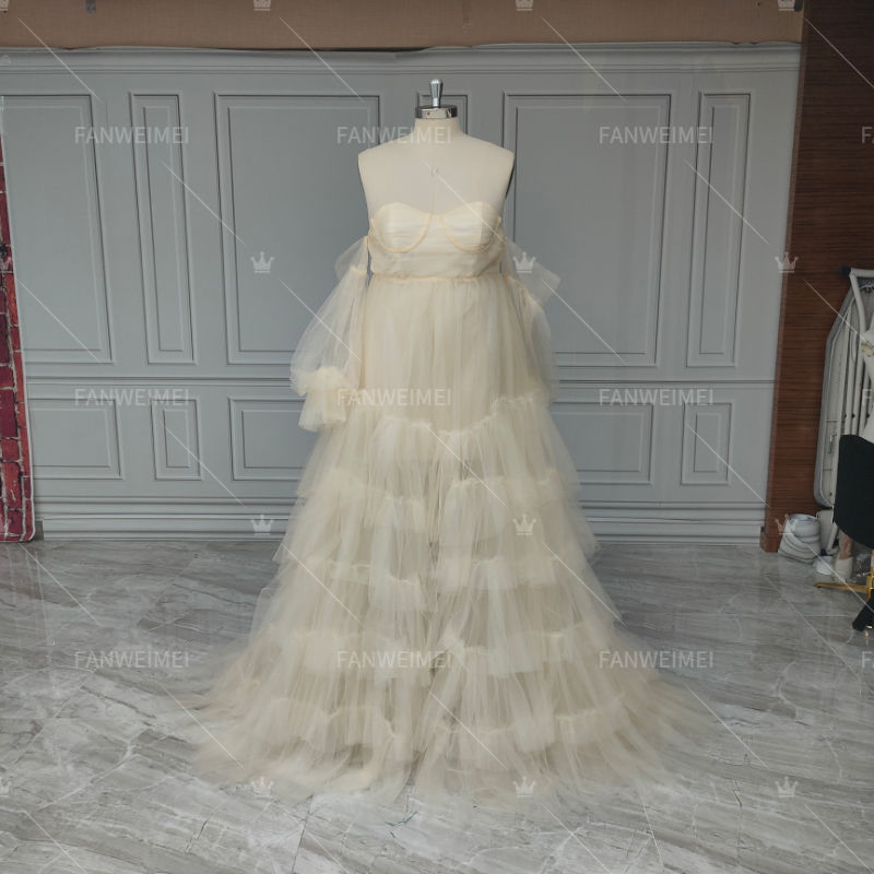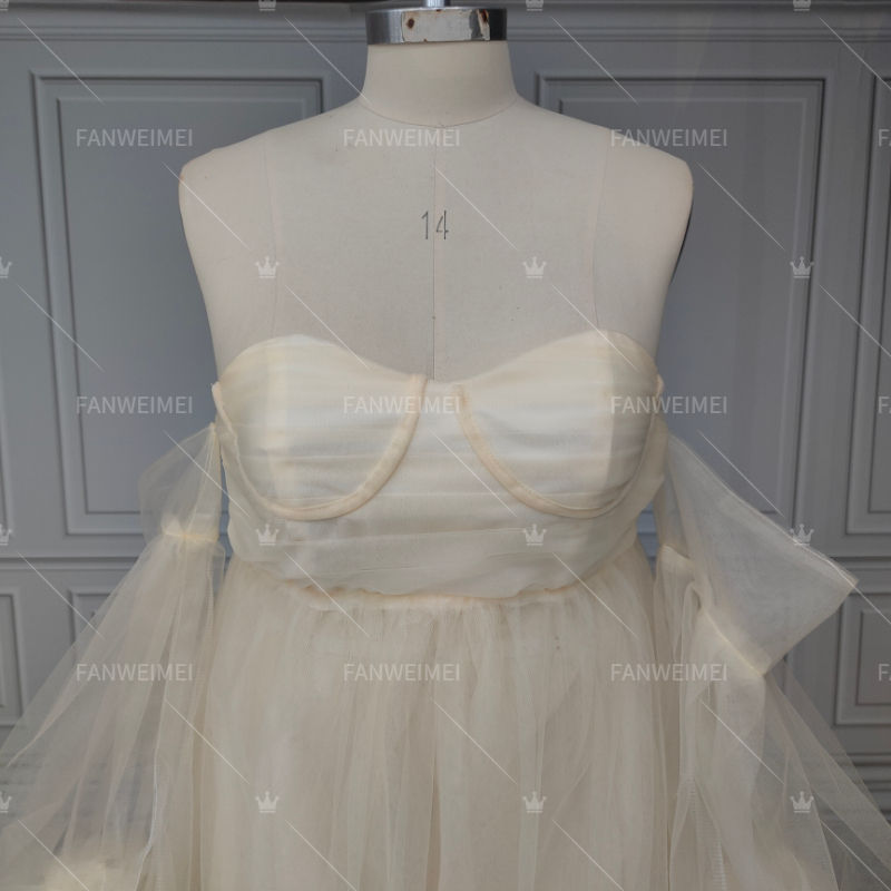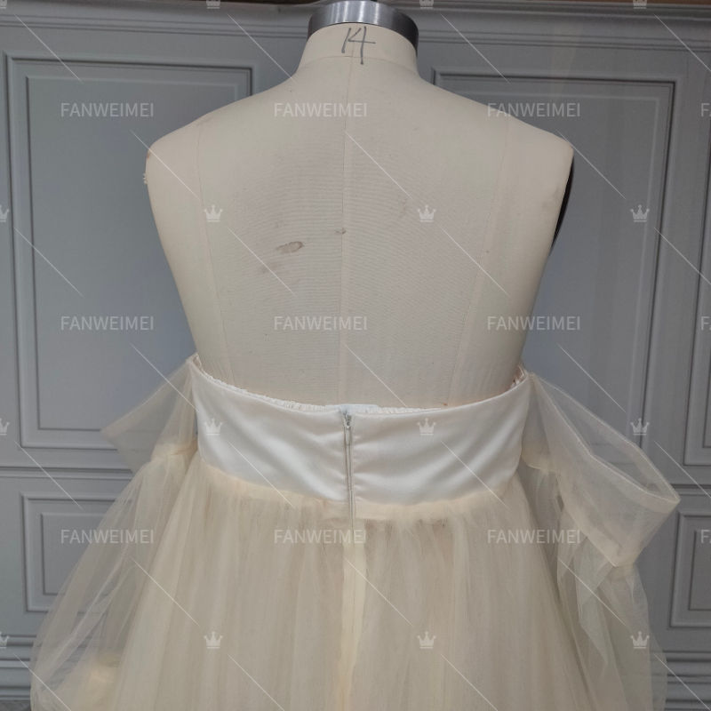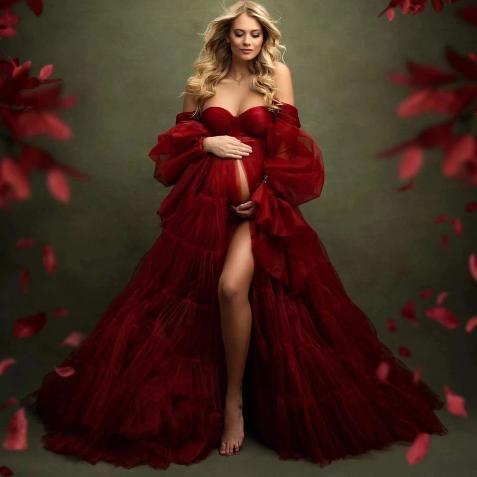 Abito Premaman Lungo in Tulle di Alta Qualità con Pancia Scoperta, Spalle Scoperte e Maniche Corte a Sbuffo per Servizi Fotografici