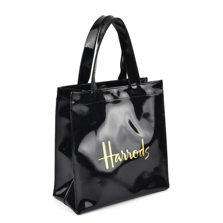 High Quality Luxury Bag Bales Custom Printing PVC Tote Black Mirror Glossy Style Shiny PU Leather Waterproof Shopping Bag