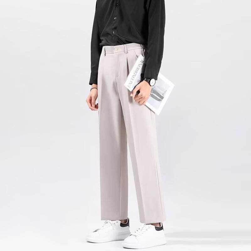 Pantaloni eleganti da uomo di alta qualità estivi pantaloni larghi neri pieghettati larghi con gamba larga a metà vita piatta anteriore leggera