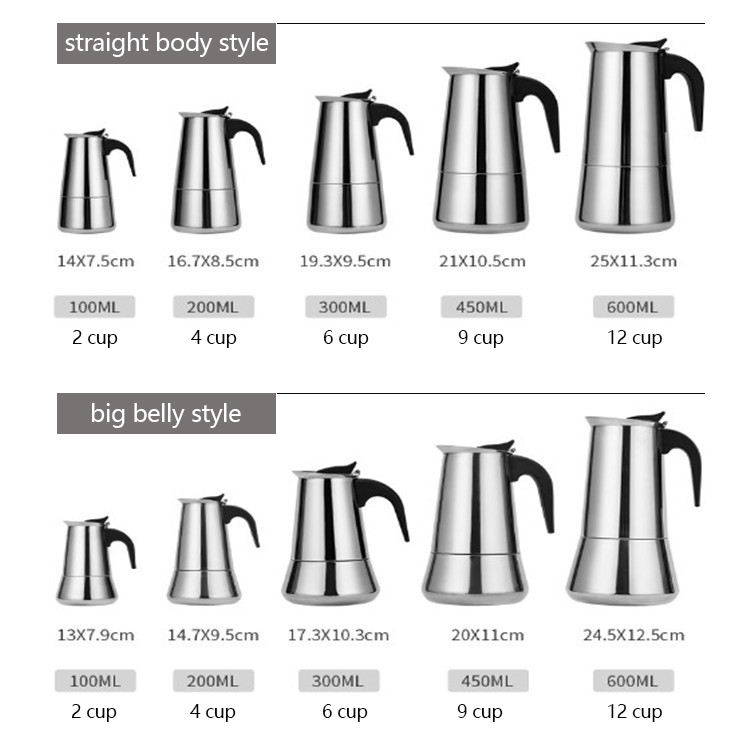 High Quality Mini Stainless Steel Moka Pot Coffee Maker 2/4/6/9/12 Cup 100/200/300/450/600ml Silver Espresso Cafetiere