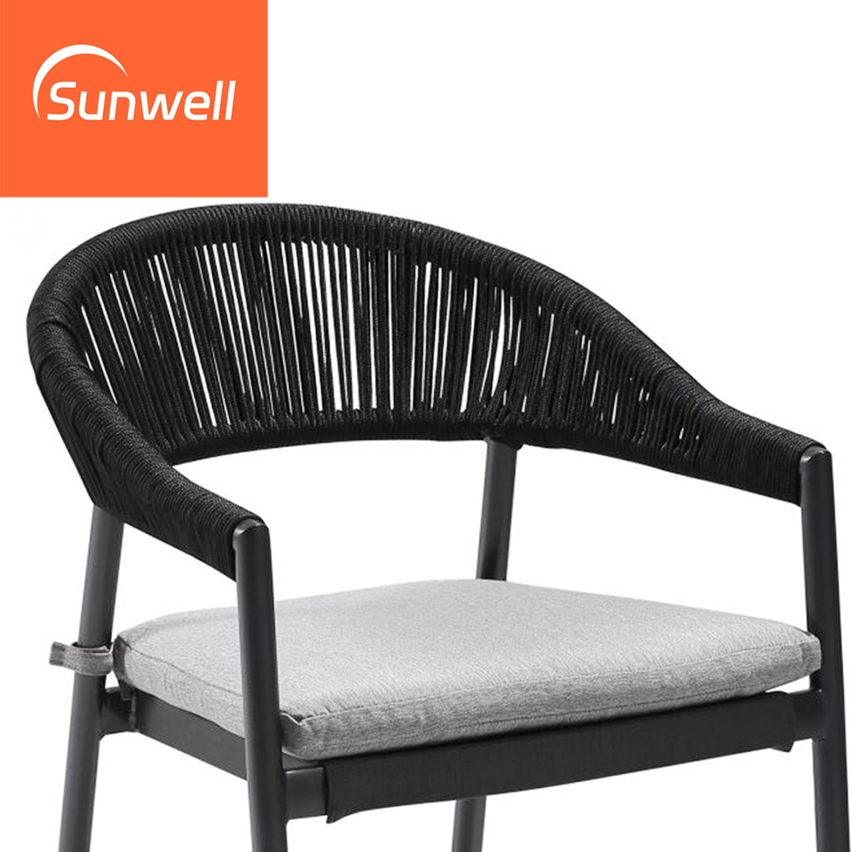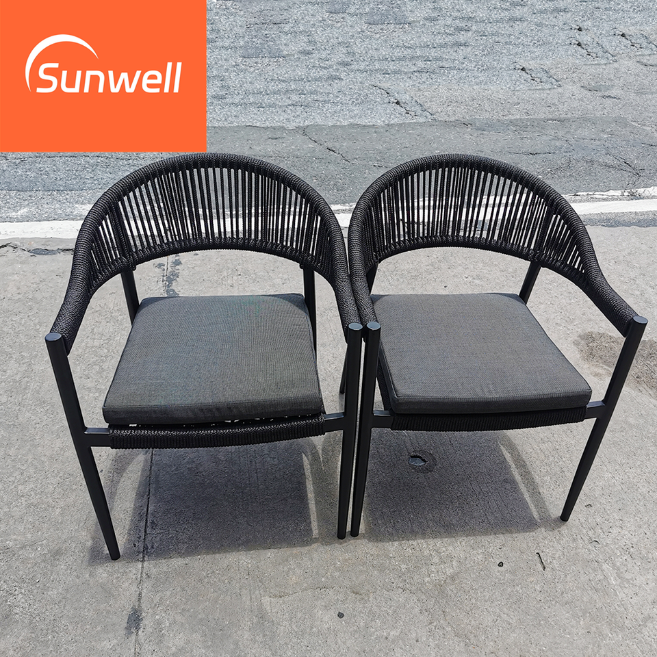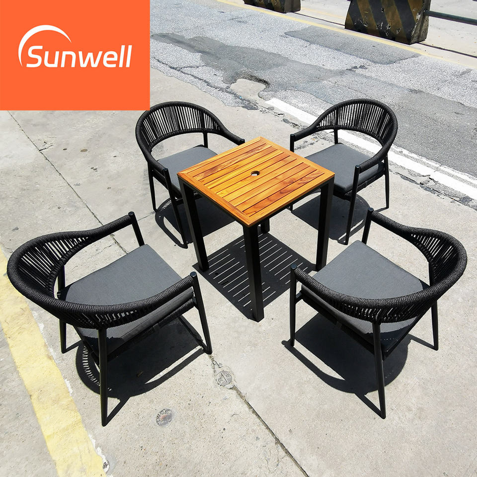 High Quality Modern Outdoor Garden Restaurant Dining Set Wooden Square Table Rope Aluminum Frame Stackable Chairs for Hotel