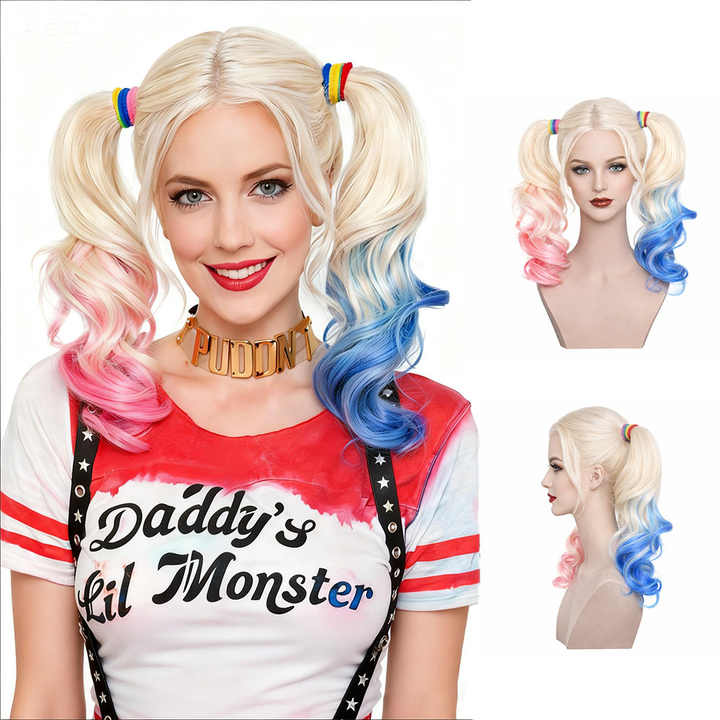 Parrucca di Alta Qualità per Cosplay di Harley Quinn da Suicide Squad, Parrucca da Clown Ricciola Sfumata Rosa e Blu con Doppi Coda di Cavallo