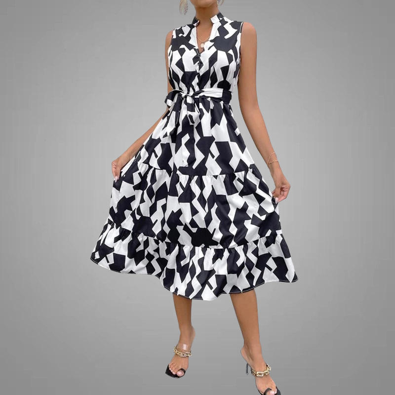 Abiti da donna con cintura con orlo arricciato con stampa di alta qualità abiti Casual senza maniche con bottoni sul davanti balza una linea elegante abito da donna