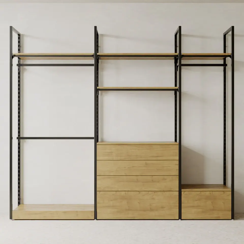 Armadio aperto in legno di Teak di alta qualità con sistema di scaffalature modulari in acciaio artigianale