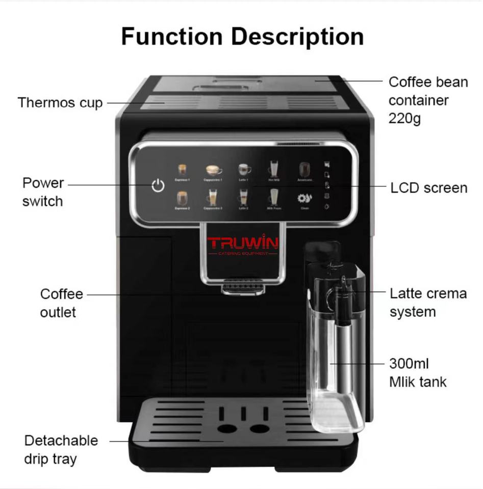 Truwin Macchina espresso automatica inox 1.2–1.8L 220V con macinatura e schiuma automatiche, sistema acqua calda, CE/ETL/CB, 1 anno