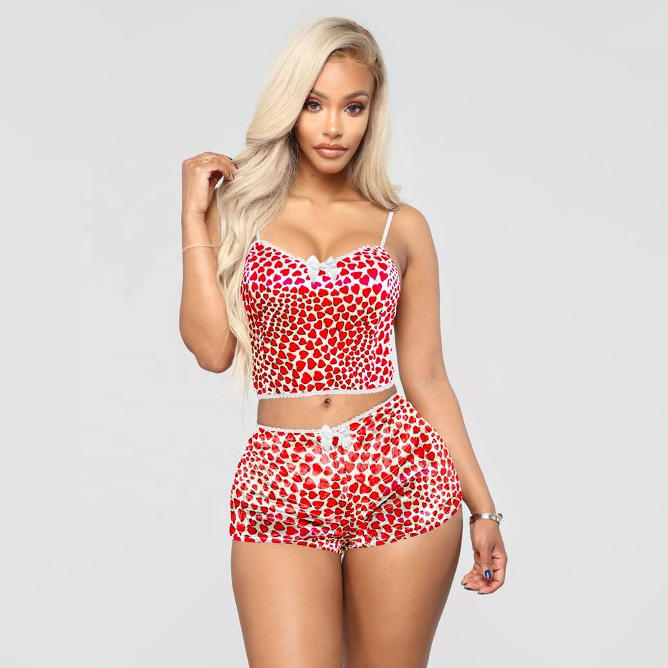 Set di biancheria intima in velluto lucido da due pezzi con stampa da donna sexy da notte graziosi pigiami da salotto Ogni set confezionato in una borsa poli con cerniera. Personalizzare l'imballaggio è disponibile.
