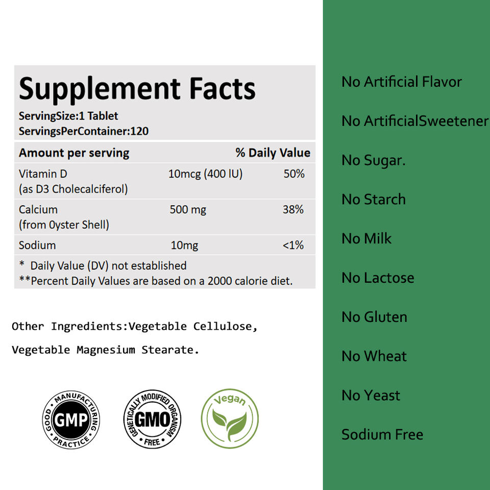 Main Ingredient:Vitamin D (as D3 Cholecalciferol): 10 mcg (400 IU), Calcium (from Oyster Shell): 500 mg, Sodium: 10 mg