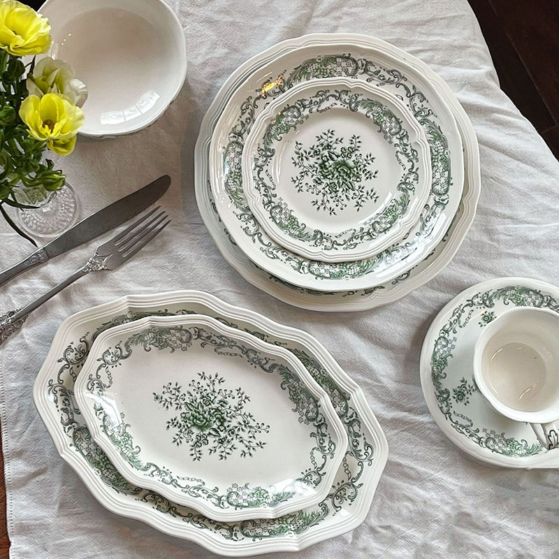 Servizio di Piatti e Stoviglie in Ceramica di Alta Qualità con Fiori a Rilievo Stile Vintage Classico Europeo Verde Oliva
