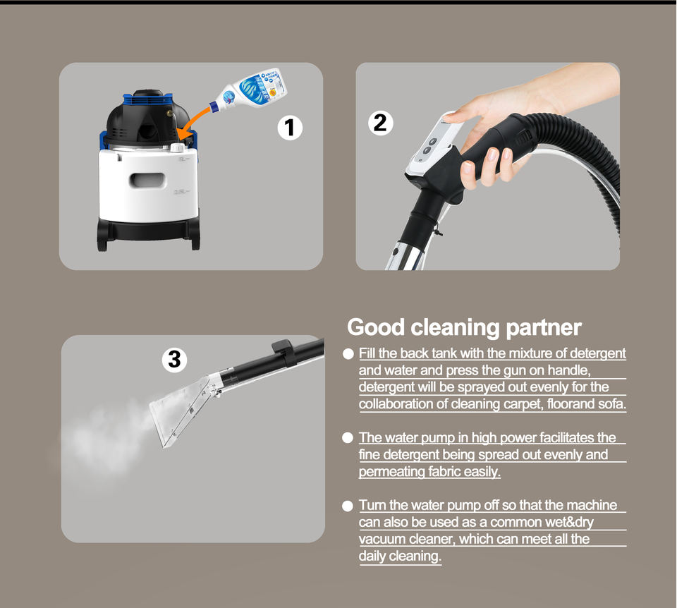 Capacità del serbatoio d'acqua:Assemblaggio del tubo, tubi in plastica, spazzola rotonda, spazzola per pavimenti, bocchetta per fessure