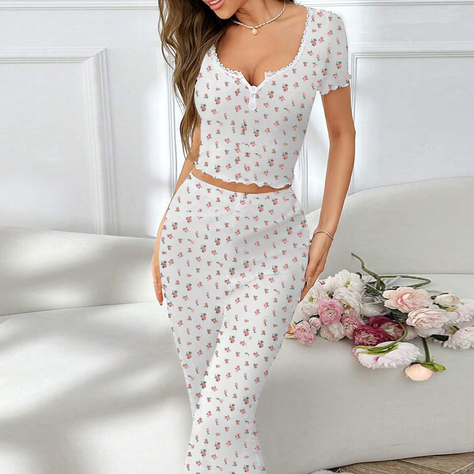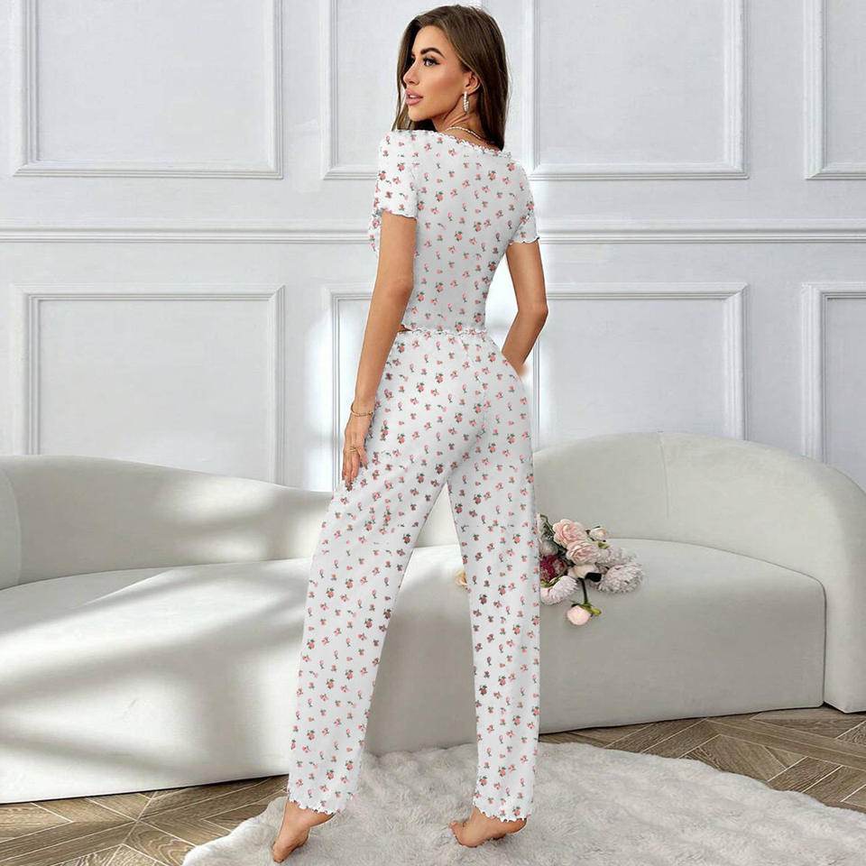 Set da Casa di Alta Qualità per Donna con Camicia da Notte a Maniche Corte Invernale e Pantaloni Lunghi con Orlo Arrotolato, Stampa Floreale Piccola e Motivo a Piselli, in Poliestere