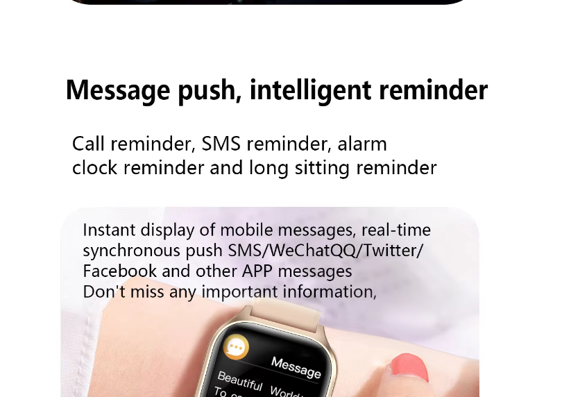 Calendar, Alarm Clock, Remote Control, Noctilucent, Sleep Tracker, Fitness Tracker, Passometer, Call Reminder, Answer Call, Push Message, Message Reminder, Dial Call, Heart Rate Tracker, Activity Tracker, Social Media Notifications, Calorie Tracker, EMAIL, Multisport Tracker, Music Player, Sedentary Reminder, Video Call, Menstrual Management, AI voice assistantfunction