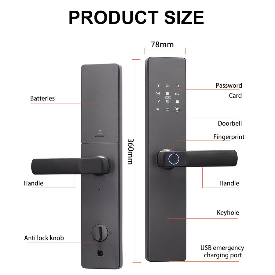 Unlock mode:Wifi remote control+Password+Fingerprint + Key+Card