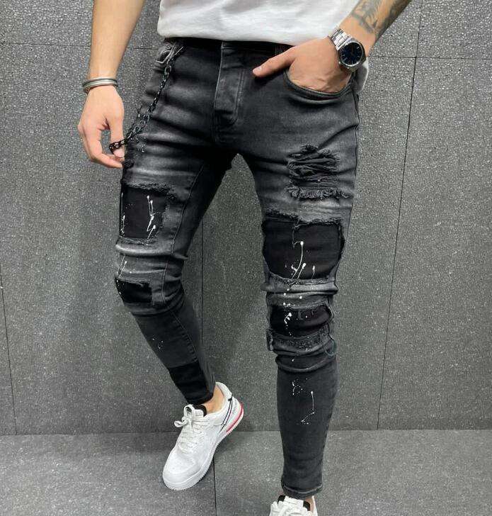 High Street Black Spray Paint Mens Jeans Pants Ripped Distressed Denim Jeans Men's Torn Hole Pants