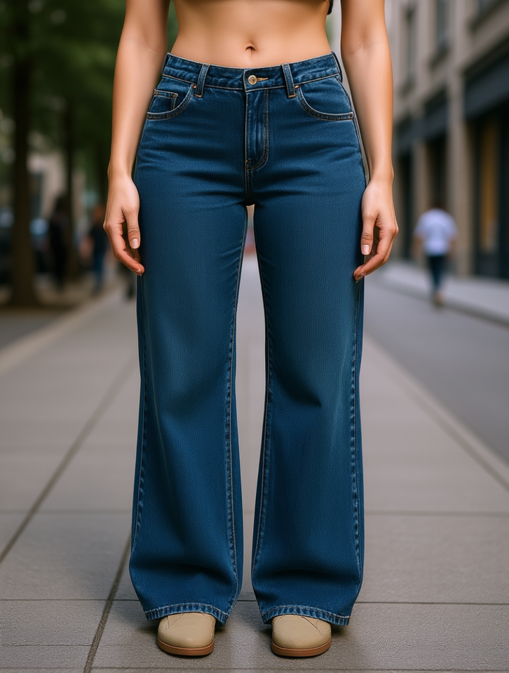 High Waist Flare Pants Women Loose Fit Full Length Casual Style Medium Wash Solid Color Breathable Elastic Fabric Autumn
