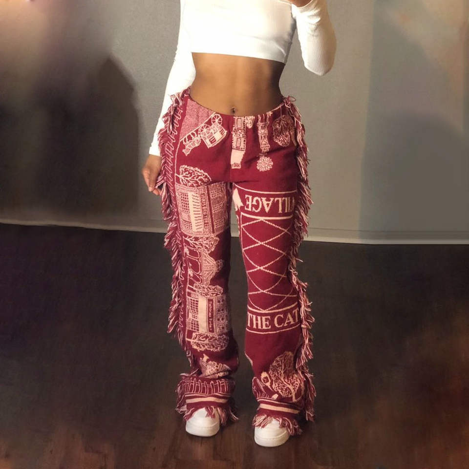 Pantaloni a vita alta stampati con nappe, design floreale, vita elasticizzata, modello cargo a gamba larga, traspiranti, vestibilità ampia, in velluto.