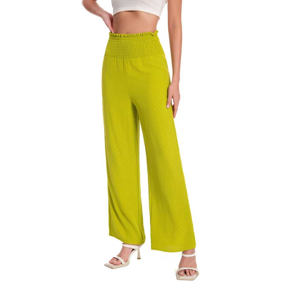 A vita alta, gamba larga, lounge, vita arricciata, effetto stropicciato