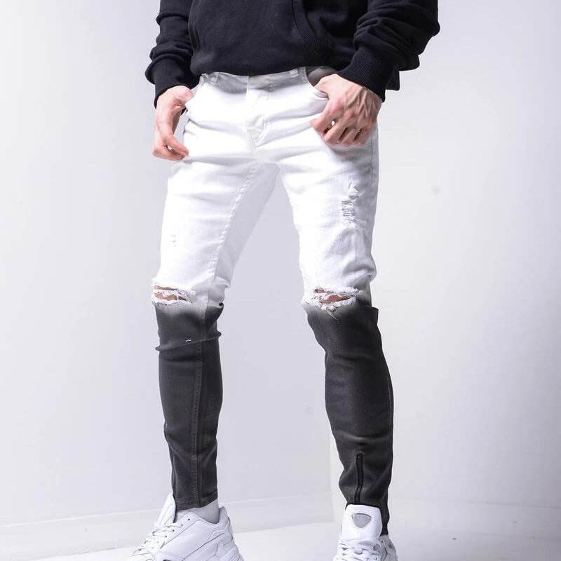 Jeans a Vita Alta Stile Dritto Strappati Elasticizzati con Design Sfumato Pantaloni Cargo di Design con Buchi Denim Scuro Lavorato a Maglia Streetwear