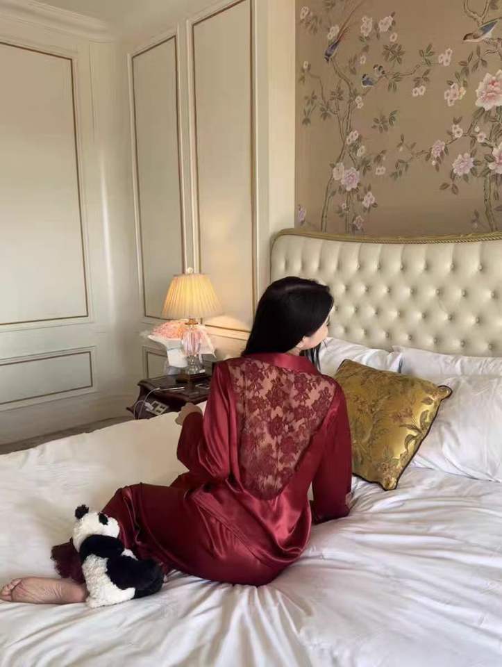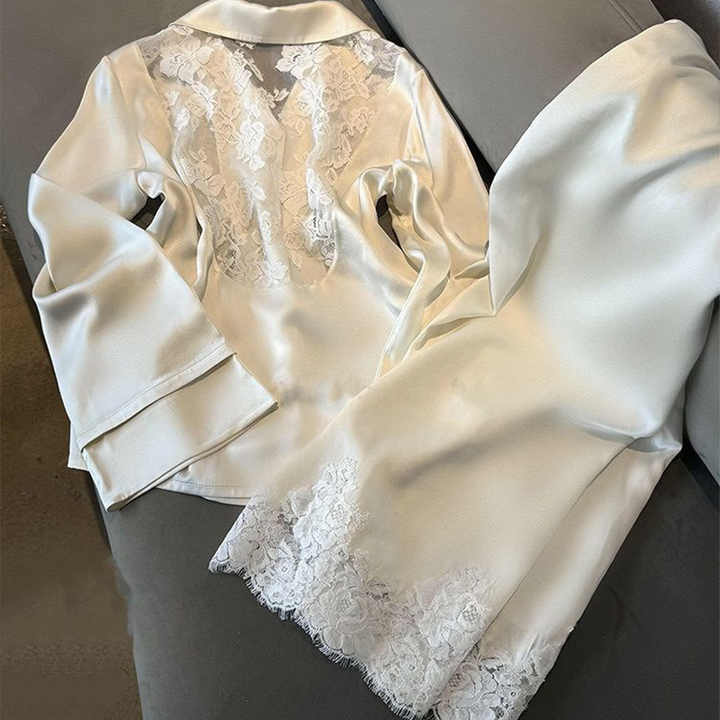 High-end Fashion Ice Silk Pajamas Women's White Moonlight Spring Homewear Lace Beautiful Back Long-sleeved Full-Length Trousers